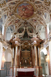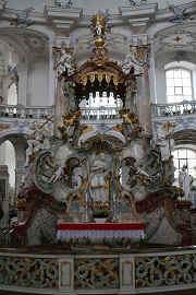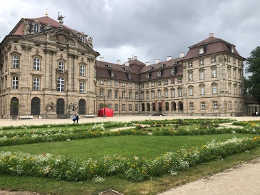 Am frühen Nachmittag besuchten wir die Basilika und Wallfahrtsort Vierzehnheiligen der Franziskaner bei Bad Staffelstein. Die von Balthasar Neumann gebaute Wallfahrtskirche ist den heiligen Vierzehn Nothelfern geweiht und wurde von 1743 bis 1772 erbaut. Der Rokoko-Altar mit den vierzehn Nothelfern steht in der Mitte des Langhauses frei im Raum. Mehrere überlappende Ovale im Innenraum schaffen einen lebendigen kurvierten Grundriss, welcher sich vom Äußeren der Kirche loslöst. Die monumentalen Dreiviertelsäulen im Inneren zeigen den herrschaftlichen Anspruch der Wallfahrtkirche. Auf dem Rückweg nach Bamberg machten wir noch einen Abstecher zum Schloss Seehof in Memmelsdorf, der ehemaligen Sommerresidenz und dem Jagdschloss der Bamberger Bischöfe. Die vierflügelige Anlage mit den markanten eckständigen Türmen wurde von 1687 bis 1696 erbaut. Die heutige Gartenanlage mit imposanter Brunnenanlage und Orangerie entstanden zwischen 1733 und 1779.