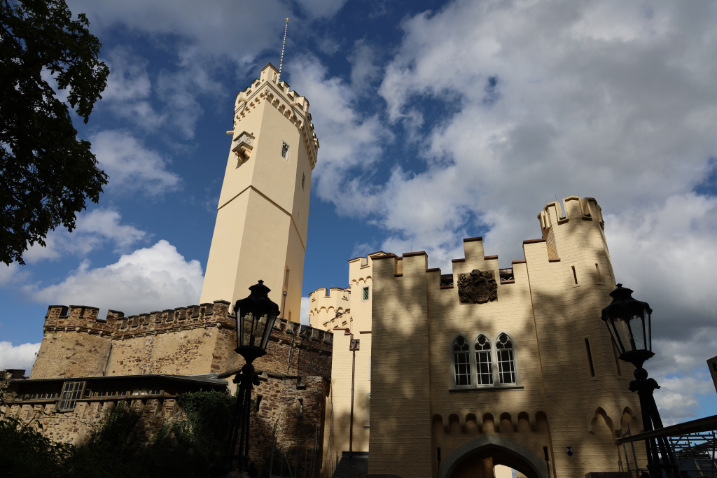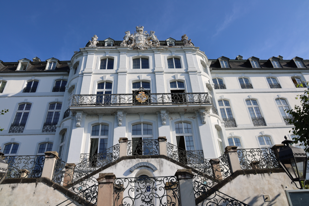 Unser erstes Reiseziel am Rhein war das Kurfürstliche Schloss Engers in Neuwied. Der Trierer Erzbischof und Kurfürst Johann Phillipp von Walderdorff hatte zwischen 1759 und 1764 auf dem Gelände der Burg Kunostein, dessen grauer Turm als einziger Rest der ehemals großen Burganlage vorhanden ist, das Jagdschloss errichtet. Der Baumeister Johannes Selz, der Hofstukkateur Michael Eytel, der Maler Januarius Zick und Bildhauer Ferdinand Dietz schufen ein prachtvolles Schloss mit einem großen eindrucksvollen Barocksaal, geschmückt mit Bildern von Vater Rhein und der Jagdgöttin Diana im Kreise ihrer zahlreichen Nymphen und Faune. Wegen des schönen sonnigen Wetters konnten wir unsere Pause traditionell mit einem ausgewählten Glas Sekt auf der Terrasse des Schloss Engers mit Rheinblick genießen.