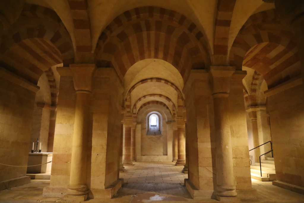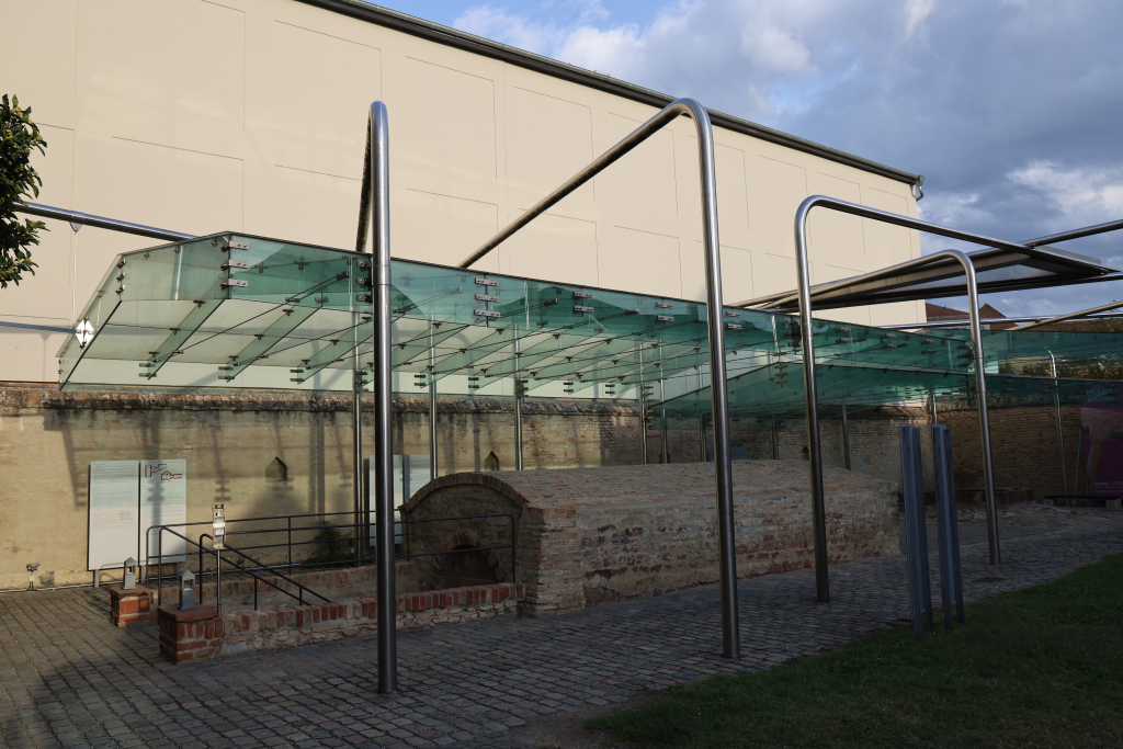 Schon am Nachmittag konnten wir unsere Zimmer im Hotel Goldener Engel in der Innenstadt von Speyer beziehen. Am späten Nachmittag startete die Stadtführung am westlichen Stadttor, dem Altpörtel. Erstes Ziel ware der Judenhof mit Mikwe, 1100 erbaut und seit 2021 UNESCO SchUM Weltkulturerbe (das Akronym SchUM setzt sich aus den Anfangsbuchstaben der hebräischen Städtenamen von Speyer (Schpira = Sch), Worms (Warmaisa = U) und Mainz (Magenaza = M) zusammen). Ein romanisches Portal und eine steile Treppe führten in den Aus- und Ankleideraum bis in die Mikwe (lebendiges Wasser), welche als älteste jenseits der Alpen gilt. Die restlichen Eingangsgebäude, Männer- und Frauensynagoge sind nur noch rudimentär erhalten.