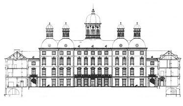 Baufällige und vernachlässigte Bauteile wurden abgerissen. Beim Abriss der Kapelle gab es vier Tote und mehrere Verletzte. Die beiden Vorgebäude wurden bis auf die großen Gewölbekeller abgerissen, auf denen man zweigeschossige Aufbauten errichtete. Die offenen Arkaden in den Flügeln am Innenhof wurden durch Fenster und Türen geschlossen. Im Erdgeschoss des Nordflügels wurde die tragende Wände entfernt. Im großen Speisesaal dort sorgten nun massive Säulen für ausreichende Statik. Die Altane - Säulenvorbauten, die im 1. Stock als Balkon dienten - an den Flügelenden und vor dem Mittelteil waren baufällig. Der Abriss war billiger als eine Reparatur. Dem Mittelflügel wurde eine evangelische Kapelle vorgebaut. Der größte Eingriff in das Innere war die Entfernung der Haupttreppen mit ihrer Stukkatur, wertvollen Statuen und den herrlichen Fresken von Pellegrini und Zanetti an den Wänden und Unterseiten der Treppen. Da die Pferdefuhrwerke mit den Baumaterialien den steil von Westen ansteigenden Weg nicht schafften, wurde dort ein Hohlweg angelegt und der halbe Innenhof abgeschrägt. Das Eingangstor wurde um fünf Meter tiefer angebracht.